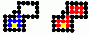 该算法事先给定一像素点作为种子点,再以该种子点为起点朝四连通或八连通方向递归填充,如下图所示,左边为四连通填充效果,右边为八连通填充效果。但这种算法它仍基于像素,且区域内每一像素点均需入栈,易堆栈溢出,所以一般也不采用。